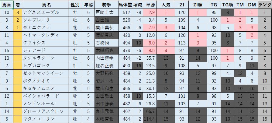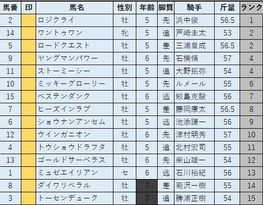 ランク上位と人気が比例していました。こういう場合は堅い単勝決着が多くランク1位、2位が勝つ確率が高いのがこの表の傾向です。